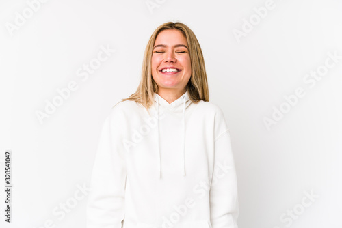 Young blonde caucasian woman isolated laughs and closes eyes, feels relaxed and happy.