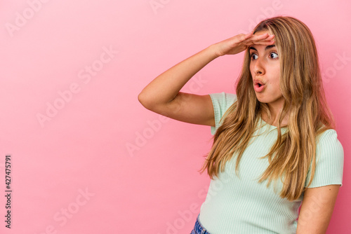 Young blonde caucasian woman isolated on pink background looking far away keeping hand on forehead.