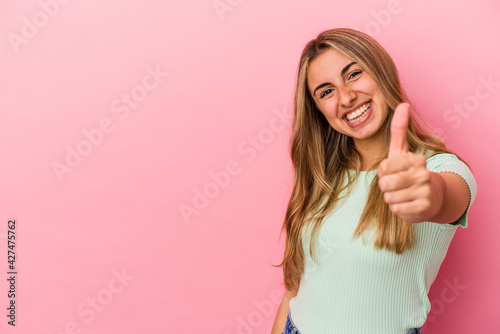 Young blonde caucasian woman isolated on pink background smiling and raising thumb up