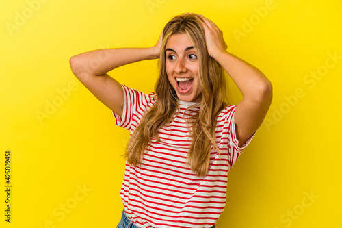 Young blonde caucasian woman isolated on yellow background screaming, very excited, passionate, satisfied with something.