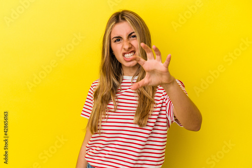 Young blonde caucasian woman isolated on yellow background showing claws imitating a cat, aggressive gesture.