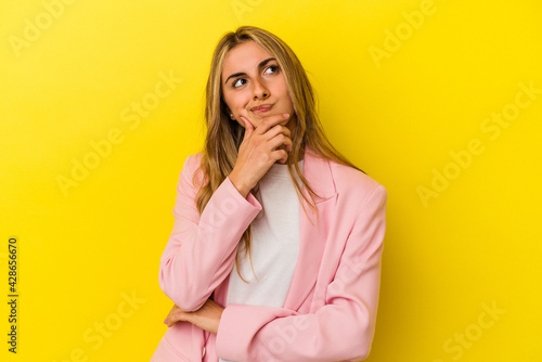 Young blonde caucasian woman isolated on yellow background thinking and looking up, being reflective, contemplating, having a fantasy.