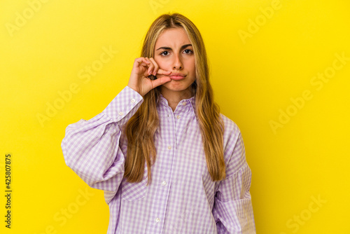 Young blonde caucasian woman isolated on yellow background with fingers on lips keeping a secret.