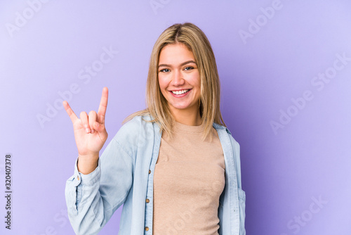 Young blonde caucasian woman isolated showing a horns gesture as a revolution concept.