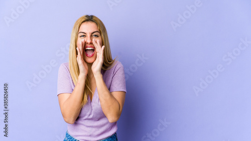 Young blonde caucasian woman shouting excited to front.