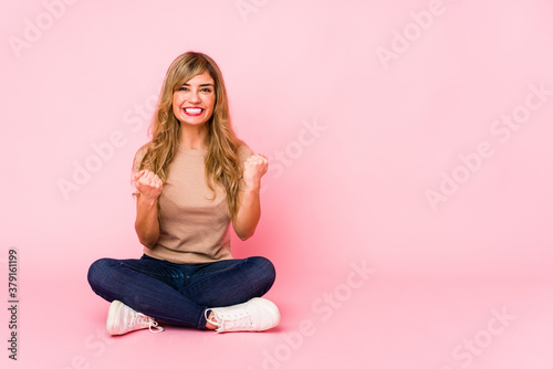 Young blonde caucasian woman sitting on a pink studio cheering carefree and excited. Victory concept.
