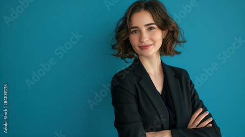 Young blonde female businesswoman in suit, standing confidently on blue background with copy space