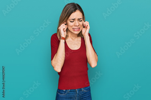 Young blonde girl wearing casual clothes covering ears with fingers with annoyed expression for the noise of loud music. deaf concept.