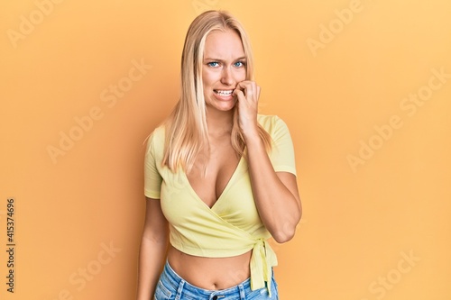Young blonde girl wearing casual clothes looking stressed and nervous with hands on mouth biting nails. anxiety problem.