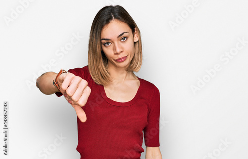 Young blonde girl wearing casual clothes looking unhappy and angry showing rejection and negative with thumbs down gesture. bad expression.