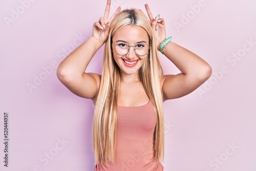 Young blonde girl wearing casual clothes posing funny and crazy with fingers on head as bunny ears, smiling cheerful