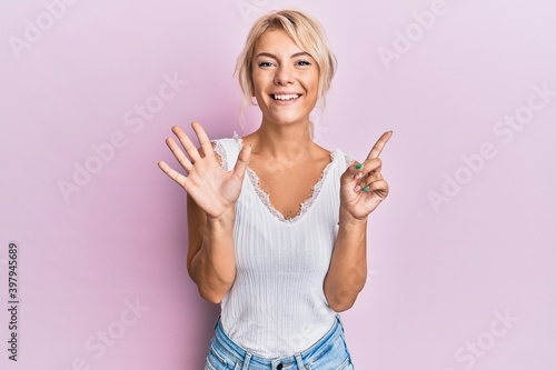 Young blonde girl wearing casual clothes showing and pointing up with fingers number six while smiling confident and happy.