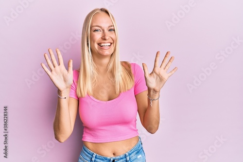 Young blonde girl wearing casual clothes showing and pointing up with fingers number ten while smiling confident and happy.