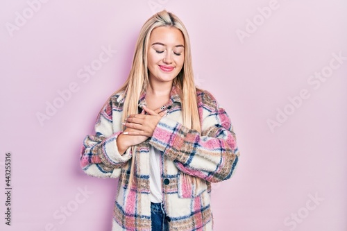 Young blonde girl wearing casual clothes smiling with hands on chest with closed eyes and grateful gesture on face. health concept.