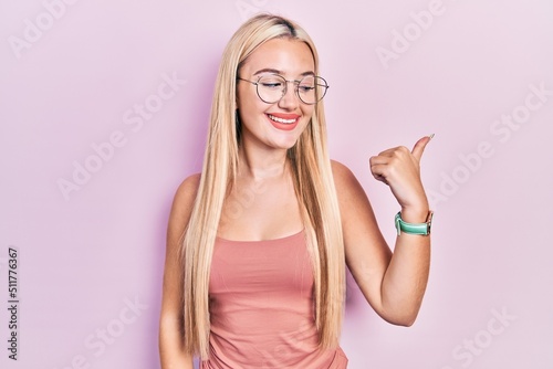 Young blonde girl wearing casual clothes smiling with happy face looking and pointing to the side with thumb up.
