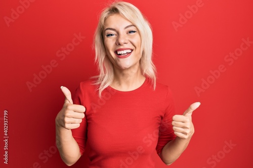 Young blonde girl wearing casual clothes success sign doing positive gesture with hand, thumbs up smiling and happy. cheerful expression and winner gesture.