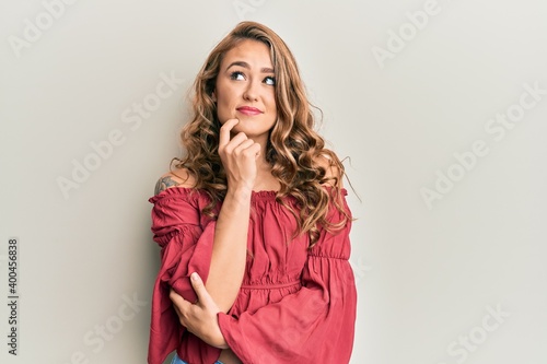 Young blonde girl wearing casual clothes thinking concentrated about doubt with finger on chin and looking up wondering