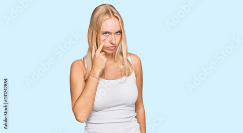 Young blonde girl wearing casual style with sleeveless shirt pointing to the eye watching you gesture, suspicious expression