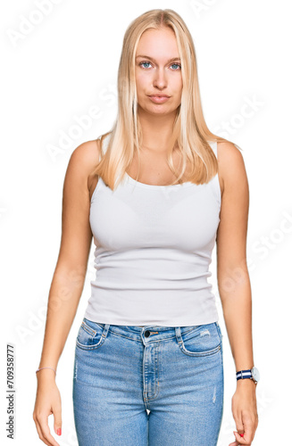 Young blonde girl wearing casual style with sleeveless shirt relaxed with serious expression on face. simple and natural looking at the camera.