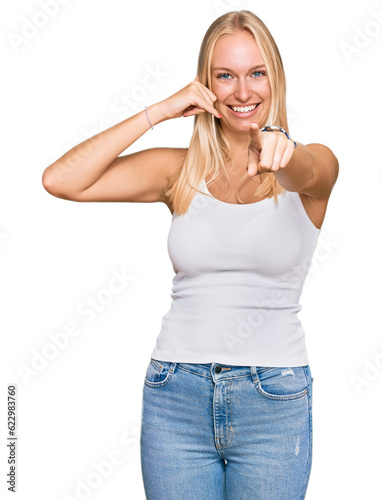 Young blonde girl wearing casual style with sleeveless shirt smiling doing talking on the telephone gesture and pointing to you. call me.
