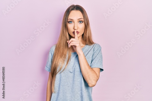 Young blonde girl wearing casual t shirt asking to be quiet with finger on lips. silence and secret concept.