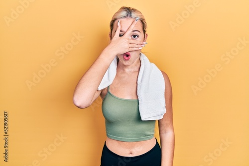 Young blonde girl wearing sportswear and towel peeking in shock covering face and eyes with hand, looking through fingers with embarrassed expression.