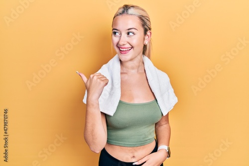 Young blonde girl wearing sportswear and towel smiling with happy face looking and pointing to the side with thumb up.