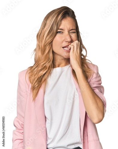 Young blonde in stylish pink suit biting fingernails, nervous and very anxious.