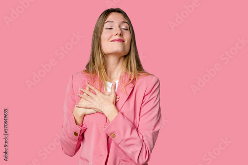 Young blonde posing for a portrait isolated, exuding natural beauty and radiance has friendly expression, pressing palm to chest. Love concept.