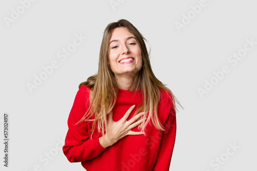 Young blonde posing for a portrait isolated, exuding natural beauty and radiance laughs out loudly keeping hand on chest.