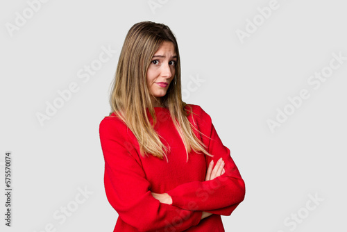 Young blonde posing for a portrait isolated, exuding natural beauty and radiance unhappy looking in camera with sarcastic expression.