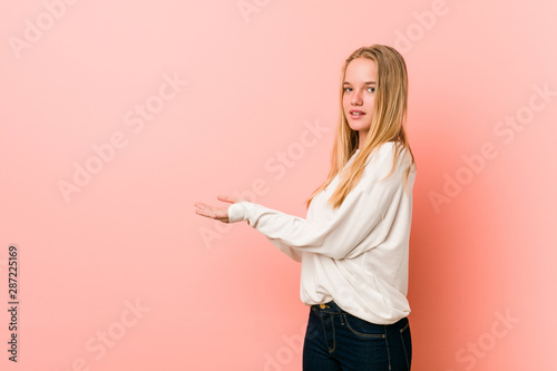 Young blonde teenager woman holding a copy space on a palm.