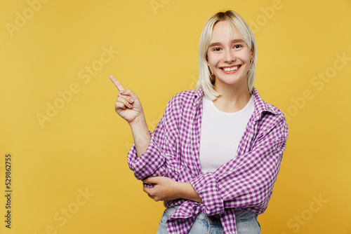 Young blonde woman 20s she wear pink tied shirt white t-shirt pointing index finger aside indicate on workspace area copy space mock up isolated on plain yellow background. People lifestyle concept.