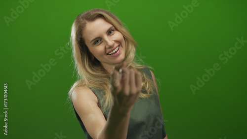 Young blonde woman gesturing come with her finger against a vibrant green isolated background, conveying a friendly invitation with a warm smile.