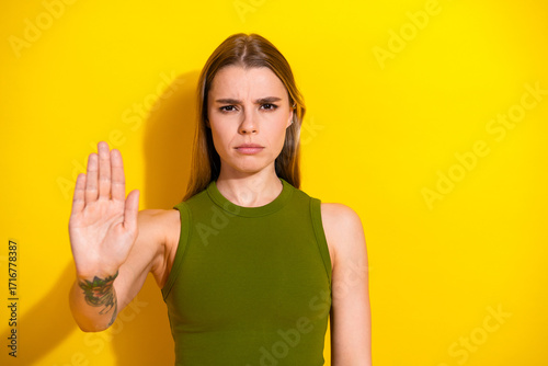 Young blonde woman gesturing stop with hand, wearing green khaki top against vibrant yellow background, serious expression