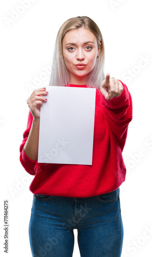 Young blonde woman holding blank paper sheet over isolated background pointing with finger to the camera and to you, hand sign, positive and confident gesture from the front
