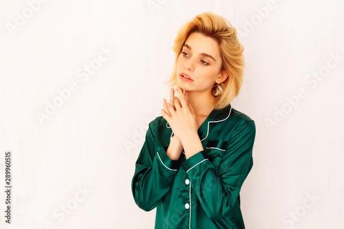 young blonde woman in green pajamas near withe wall looking left, copy space left
