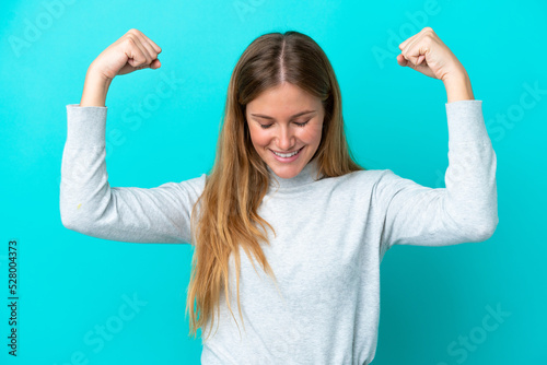 Young blonde woman isolated on blue background doing strong gesture