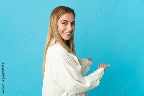 Young blonde woman isolated on blue background extending hands to the side for inviting to come