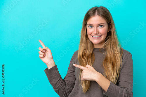 Young blonde woman isolated on blue background frightened and pointing to the side