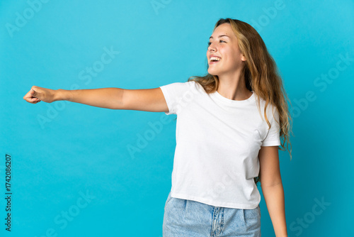 Young blonde woman isolated on blue background giving a thumbs up gesture