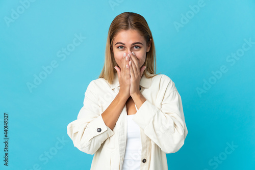Young blonde woman isolated on blue background happy and smiling covering mouth with hands
