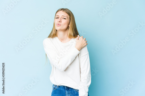 Young blonde woman isolated on blue background having a shoulder pain.