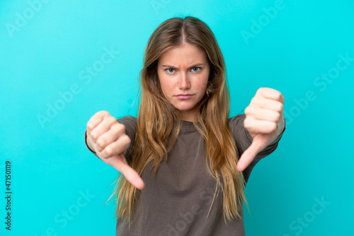 Young blonde woman isolated on blue background showing thumb down with two hands