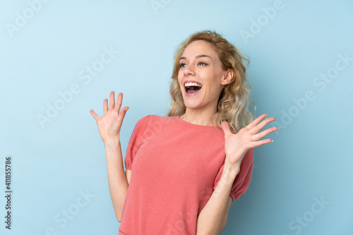Young blonde woman isolated on blue background with surprise facial expression