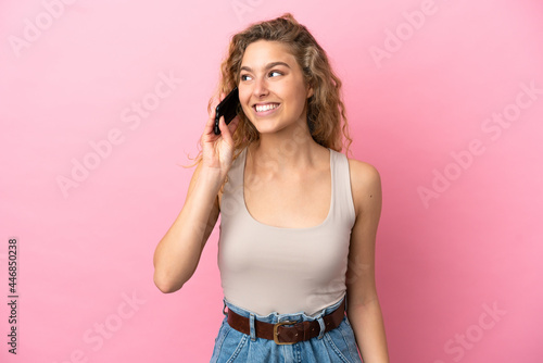 Young blonde woman isolated on pink background keeping a conversation with the mobile phone with someone