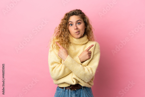 Young blonde woman isolated on pink background pointing to the laterals having doubts