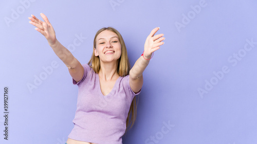 Young blonde woman isolated on purple background feels confident giving a hug to the camera.