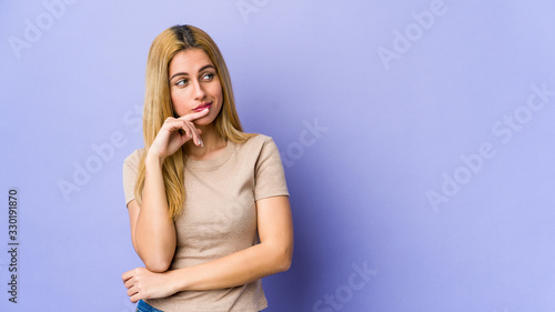 Young blonde woman isolated on purple background looking sideways with doubtful and skeptical expression.