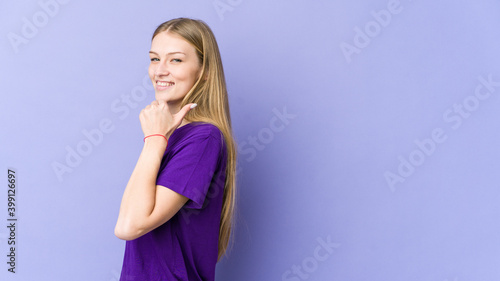 Young blonde woman isolated on purple background points with thumb finger away, laughing and carefree.